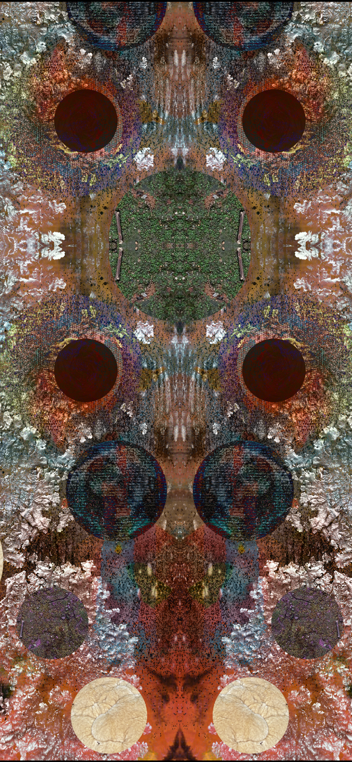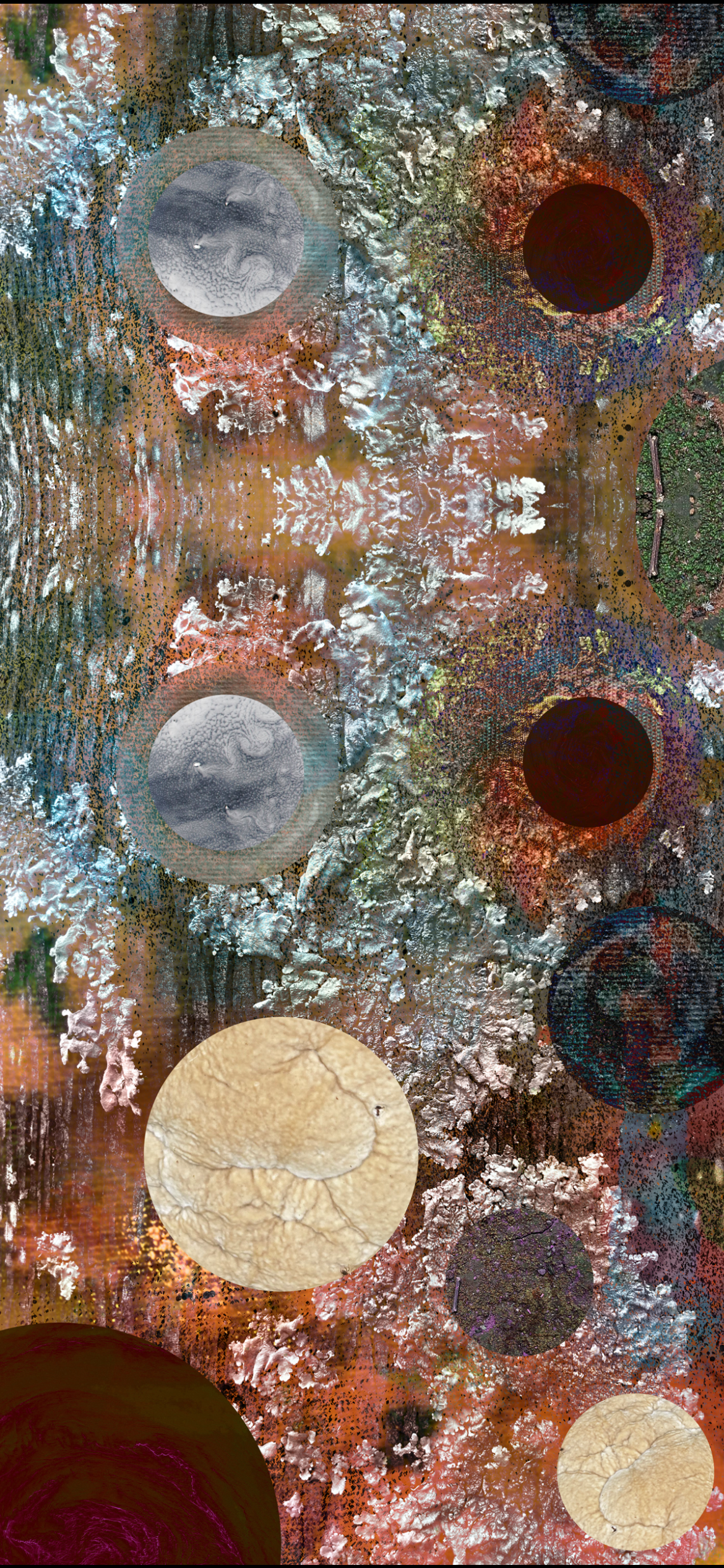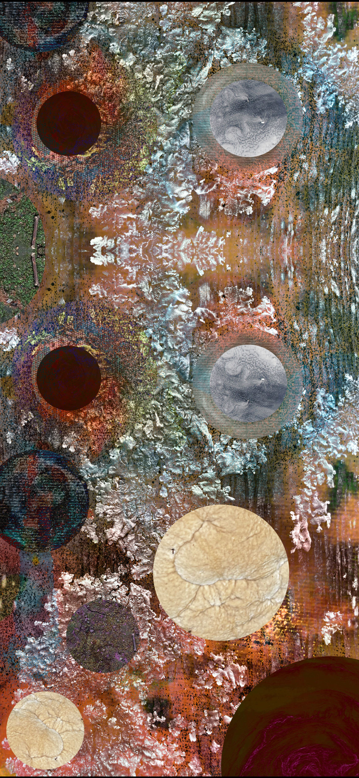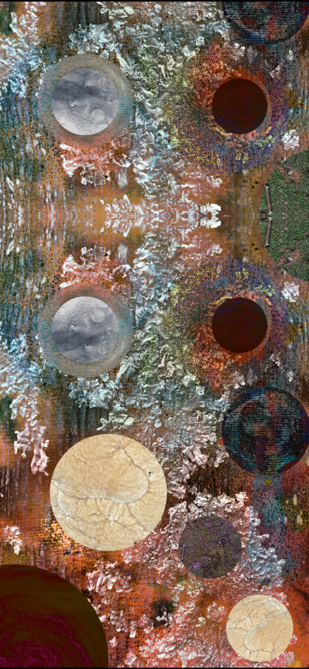Stellar Dragon, by Luciana Abrão, is a work that crosses boundaries between the micro and the macro, between the ancestral and the cosmic. In it, the archetype of the dragon—a mythical being and guardian of ancient knowledge—is reconstructed from photographic fragments of nature: textures of mushrooms, fungi, mosses, leaves, trees, and terracotta, all captured by the artist herself. Each organic element is relocated into a new cosmic order, composing not only the dragon’s skin and form but also its energy. The stellar creature emerges as if made from the living memory of the Earth and driven by the universe’s invisible currents.